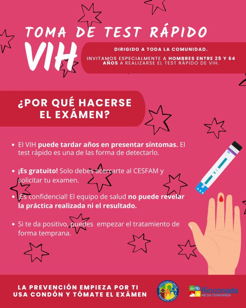 Con el propósito de reforzar la prevención y el autocuidado, el Área de Salud Municipal, a través del CESFAM realiza un llamado a la comunidad a efectuarse el test rápido de VIH, examen que se encuentra disponible de forma gratuita y confidencial para todas las vecinos de la comuna.