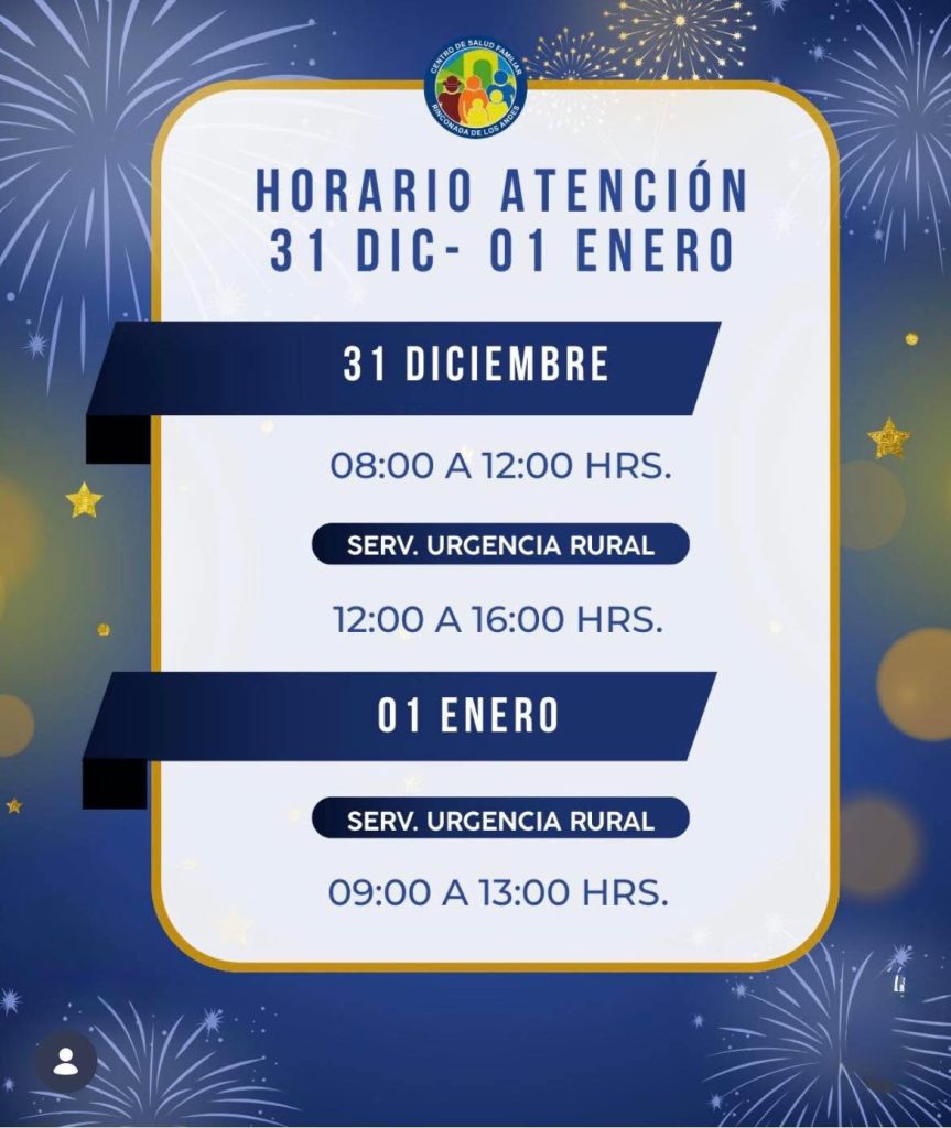 Hoy 31 de diciembre, el CESFAM atenderá en horario reducido, entre las 08:00 y las 12:00 horas, mientras que el Servicio de Urgencia Rural (SUR) funcionará entre las 12:00 y las 16:00 horas.