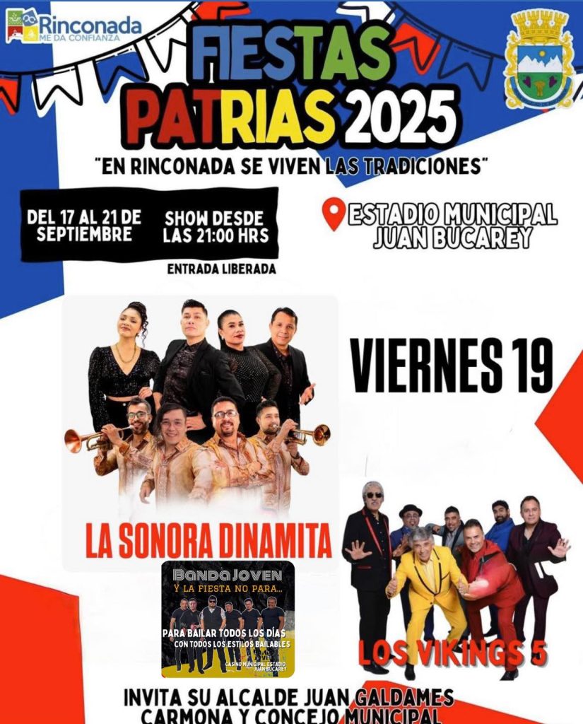 Con un gran show que contempla la presentación de “La Sonora Dinamita”, “Los Vikings 5” y la agrupación local “Banda Joven”, continuará este viernes 19 la celebración de Fiestas Patrias en Rinconada.