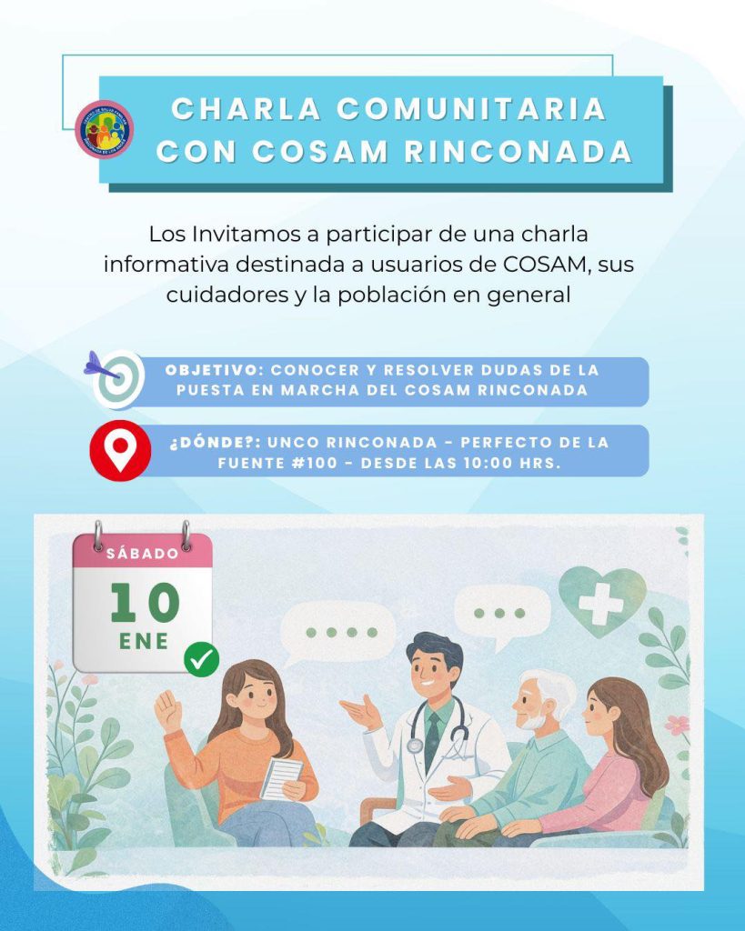 Para informar y resolver inquietudes de la comunidad, se realizará una charla informativa abierta sobre la puesta en marcha y funcionamiento del COSAM Rinconada, dirigida especialmente a usuarios del centro, sus cuidadores y vecinos en general.