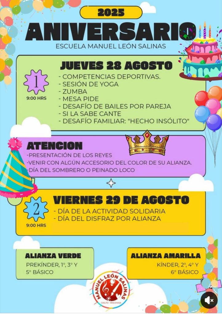 El viernes 29 de agosto continuará la celebración con el “Día de la Actividad Solidaria” y el “Día del Disfraz por Alianza”, donde los cursos se dividirán en la Alianza Verde (Prekínder, 1°, 3° y 5° básico) y la Alianza Amarilla (Kínder, 2°, 4° y 6° básico).