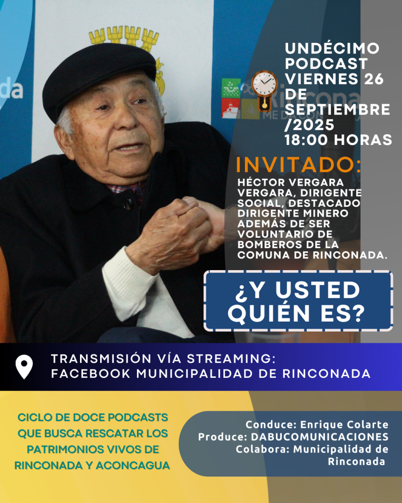 RINCONADA.- Este viernes 26 de septiembre a las 18:00 horas, será transmitido un nuevo capítulo del podcast patrimonial “¿Y usted quién es?”, un innovador ciclo de doce episodios en su primera temporada que busca rescatar y difundir los patrimonios vivos de Rinconada y del Valle del Aconcagua.