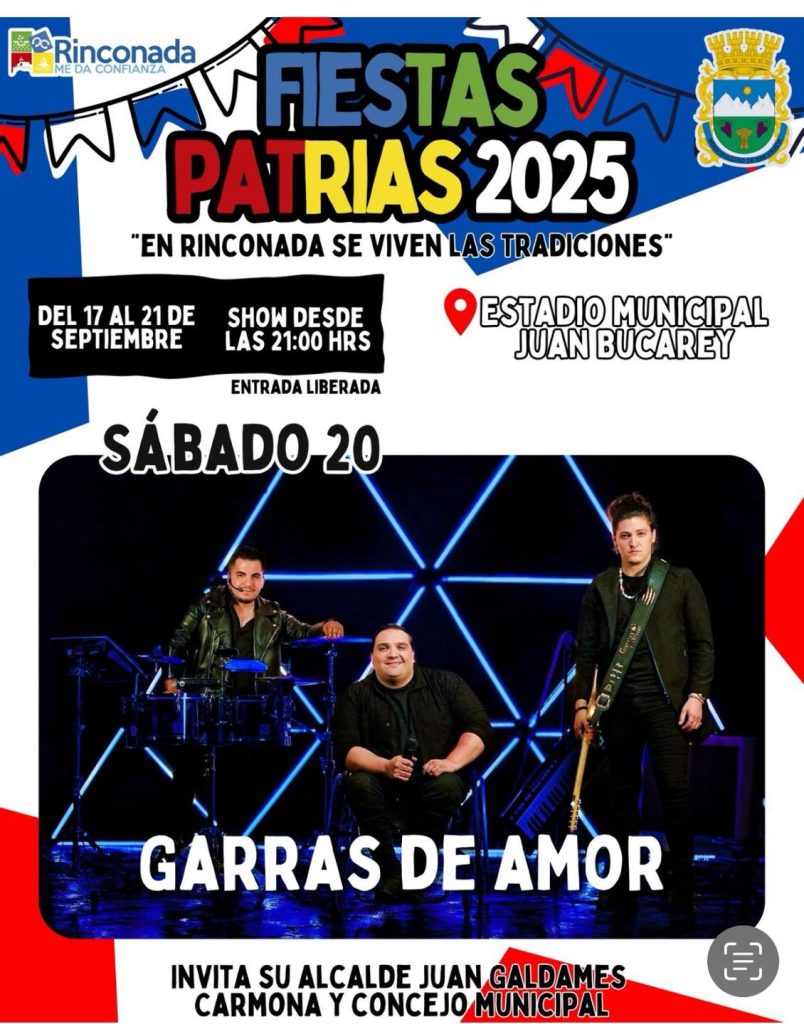 Este sábado 20 de septiembre, las Fiestas Patrias 2025 en Rinconada tendrán una noche especial con la esperada presentación a partir de las 00:00 horas, del grupo Garras de Amor en la Ramada Oficial instalada dentro del Casino Municipal del Estadio Juan Bucarey.
