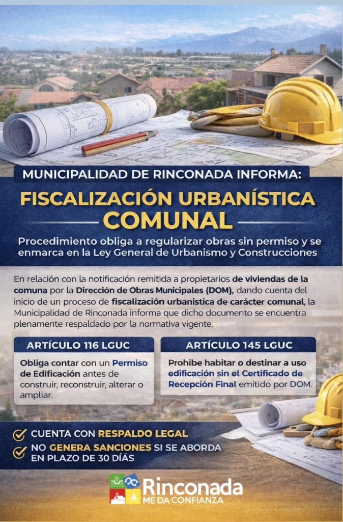 En relación con la notificación remitida a propietarios de viviendas de la comuna por la Dirección de Obras Municipales (DOM), informando el inicio de un proceso de fiscalización urbanística de carácter comunal, la Municipalidad de Rinconada aclara que dicho procedimiento se encuentra plenamente respaldado por la normativa vigente.