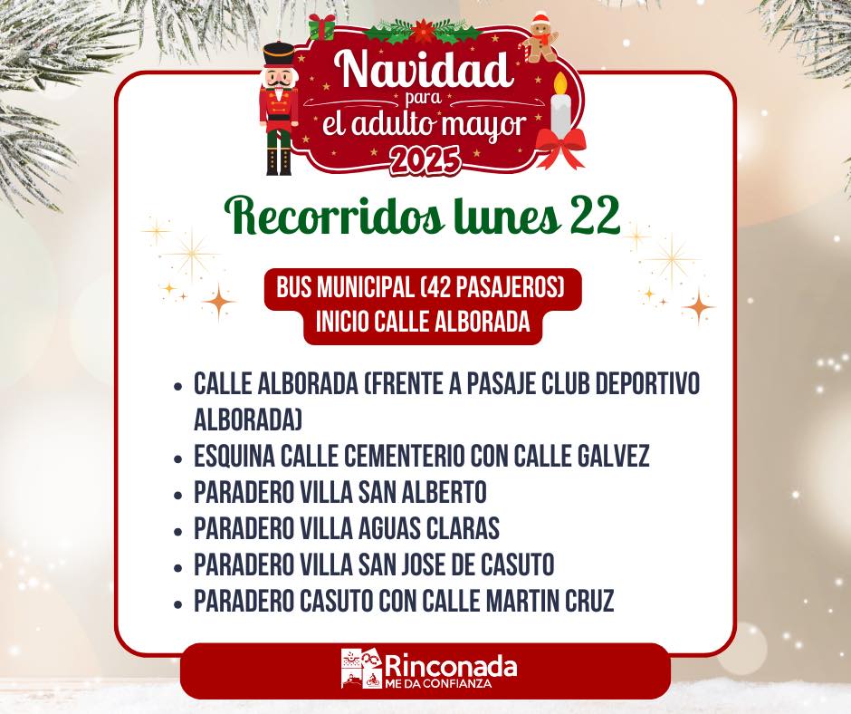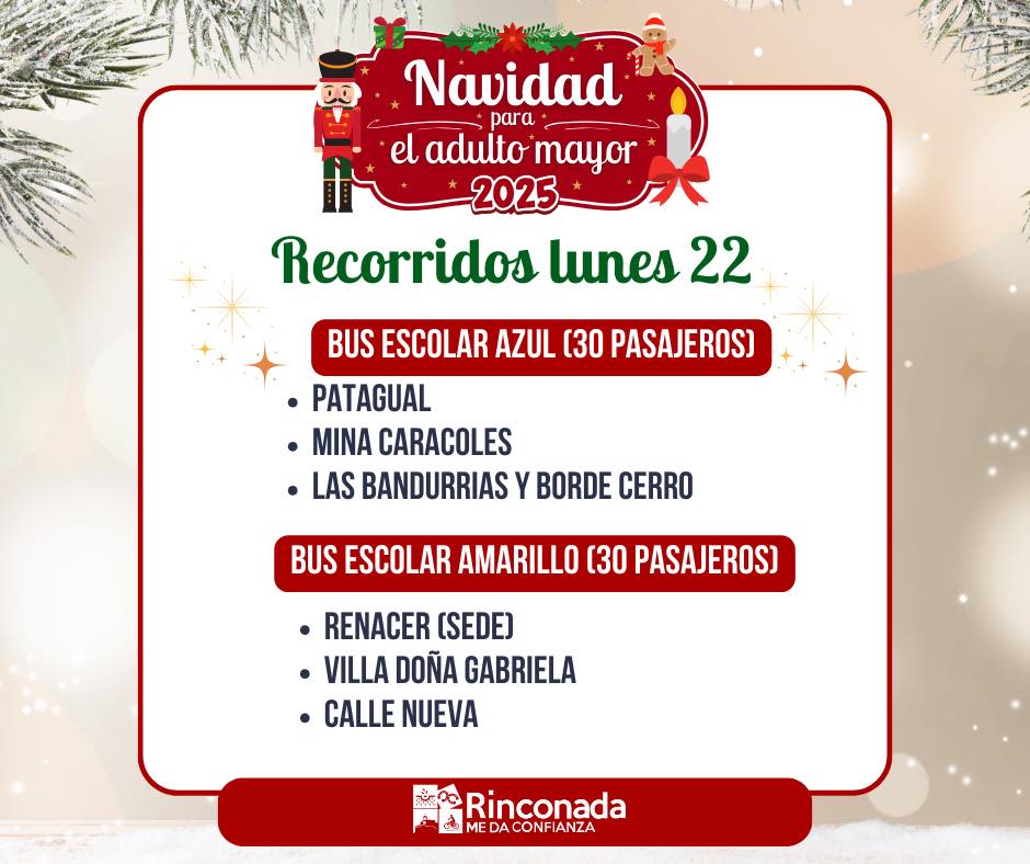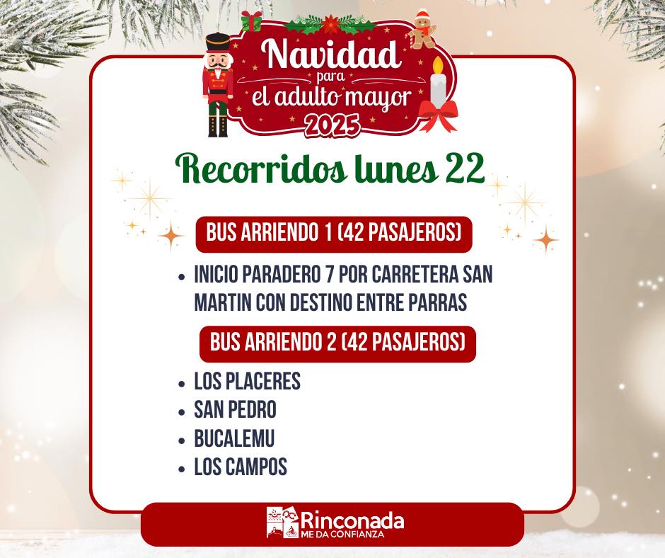 Con el objetivo de facilitar la participación de las personas mayores de la comuna, a actividad “Navidad para el Adulto Mayor”, que se desarrollará este lunes 22 de diciembre, a partir de las 13:00 horas, en el restaurante Entre Parras, la Municipalidad de Rinconada dispuso de buses de acercamiento.