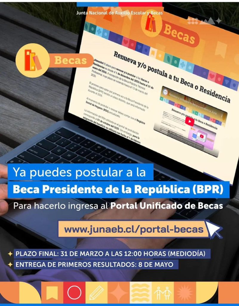 El Departamento Social de la Municipalidad informa que ya se encuentra abierto el período de postulación a la Beca Presidente de la República 2026, beneficio estatal destinado a estudiantes de Enseñanza Media y Educación Superior.