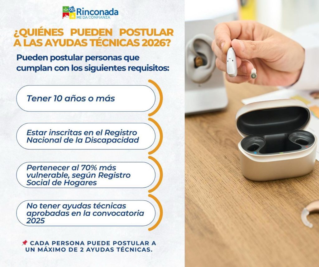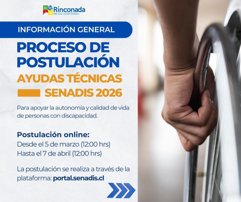 La Municipalidad de Rinconada reitera a la comunidad que el Servicio Nacional de la Discapacidad (SENADIS) mantiene abierto el proceso de postulación al Programa Regular de Ayudas Técnicas 2026, iniciativa que busca apoyar a personas con discapacidad mediante la entrega de elementos que contribuyan a mejorar su autonomía y calidad de vida.