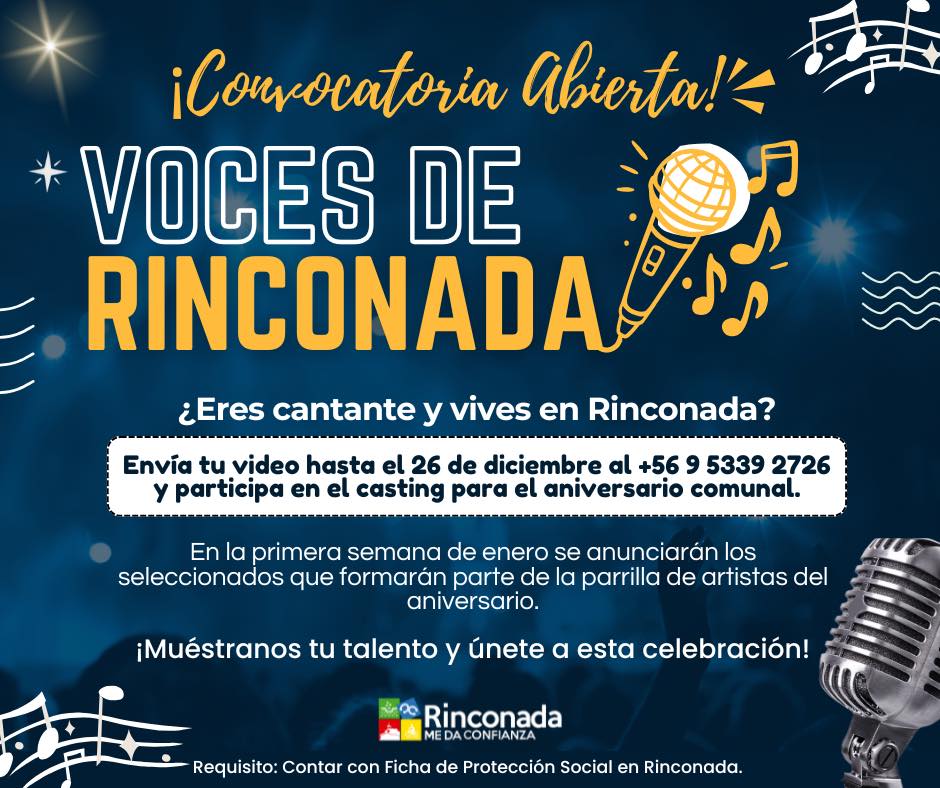 La Municipalidad de Rinconada, a través del Departamento de Eventos, hace un llamado a todos los vecinos y vecinas que posean talento vocal y deseen participar en la versión de “Voces de Rinconada”, actividad que seleccionará a los artistas locales que se presentarán en la celebración del aniversario de la comuna.