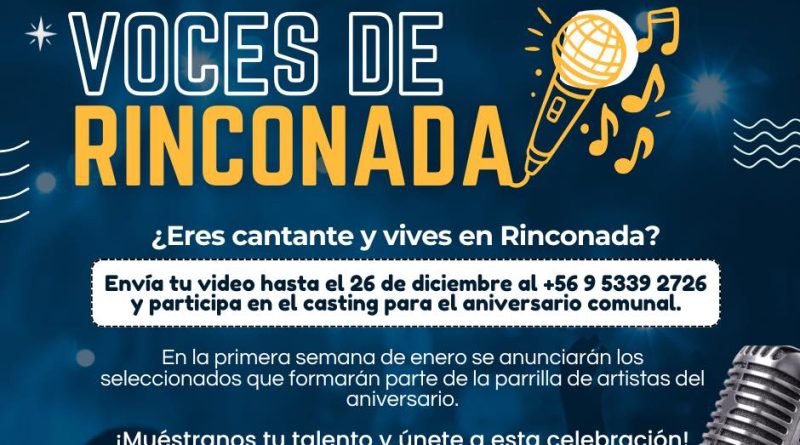 La Municipalidad de Rinconada, a través del Departamento de Eventos, hace un llamado a todos los vecinos y vecinas que posean talento vocal y deseen participar en la versión de “Voces de Rinconada”, actividad que seleccionará a los artistas locales que se presentarán en la celebración del aniversario de la comuna.
