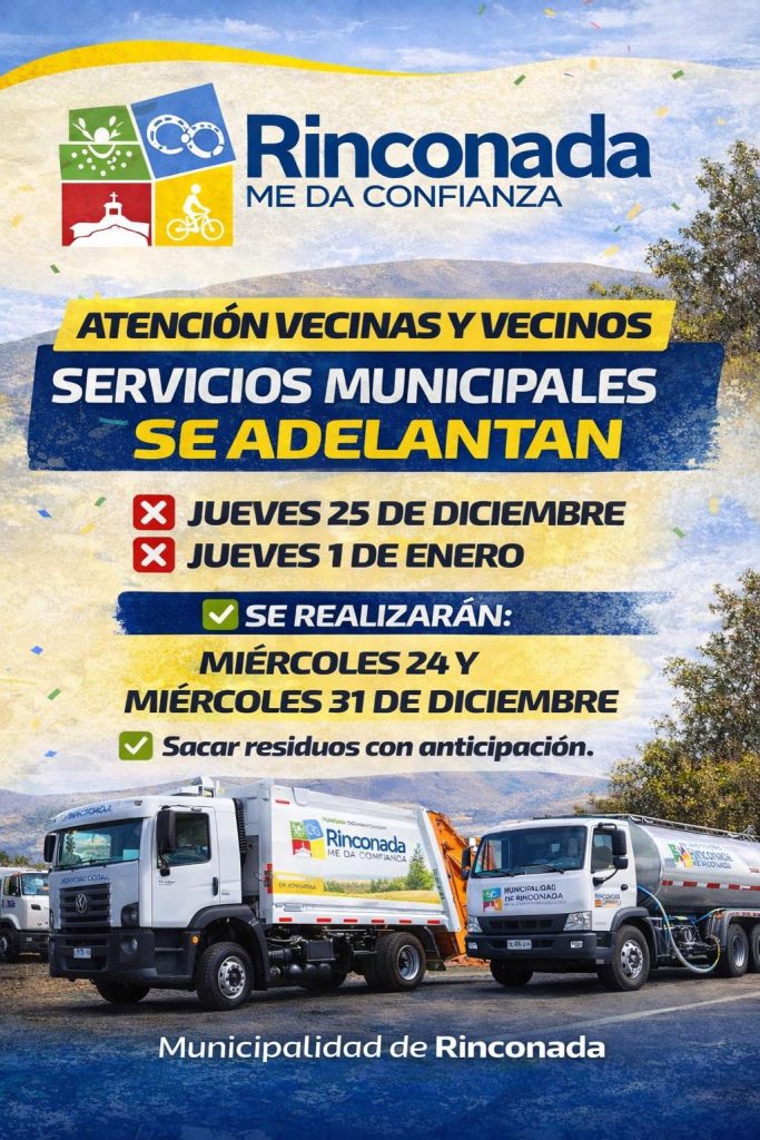 El Departamento de Maquinaria Municipal de Rinconada informó a los vecinos y vecinas de la comuna que, con motivo de las festividades de fin de año, se realizará un cambio excepcional en el calendario del retiro de residuos domiciliarios y reparto de agua potable.