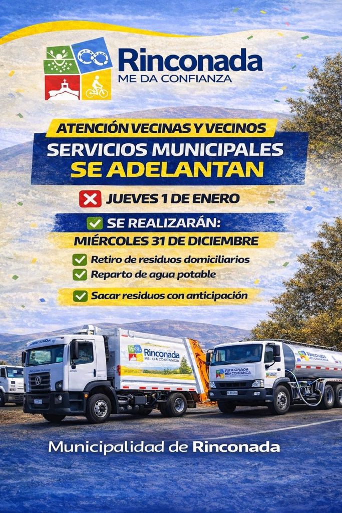 El Departamento de Maquinaria Municipal informa a la comunidad que, con motivo de la festividad de Año Nuevo, los servicios de retiro de residuos domiciliarios y reparto de agua potable programados para el jueves 1 de enero se realizarán de manera anticipada el miércoles 31 de diciembre.