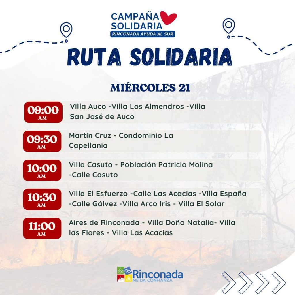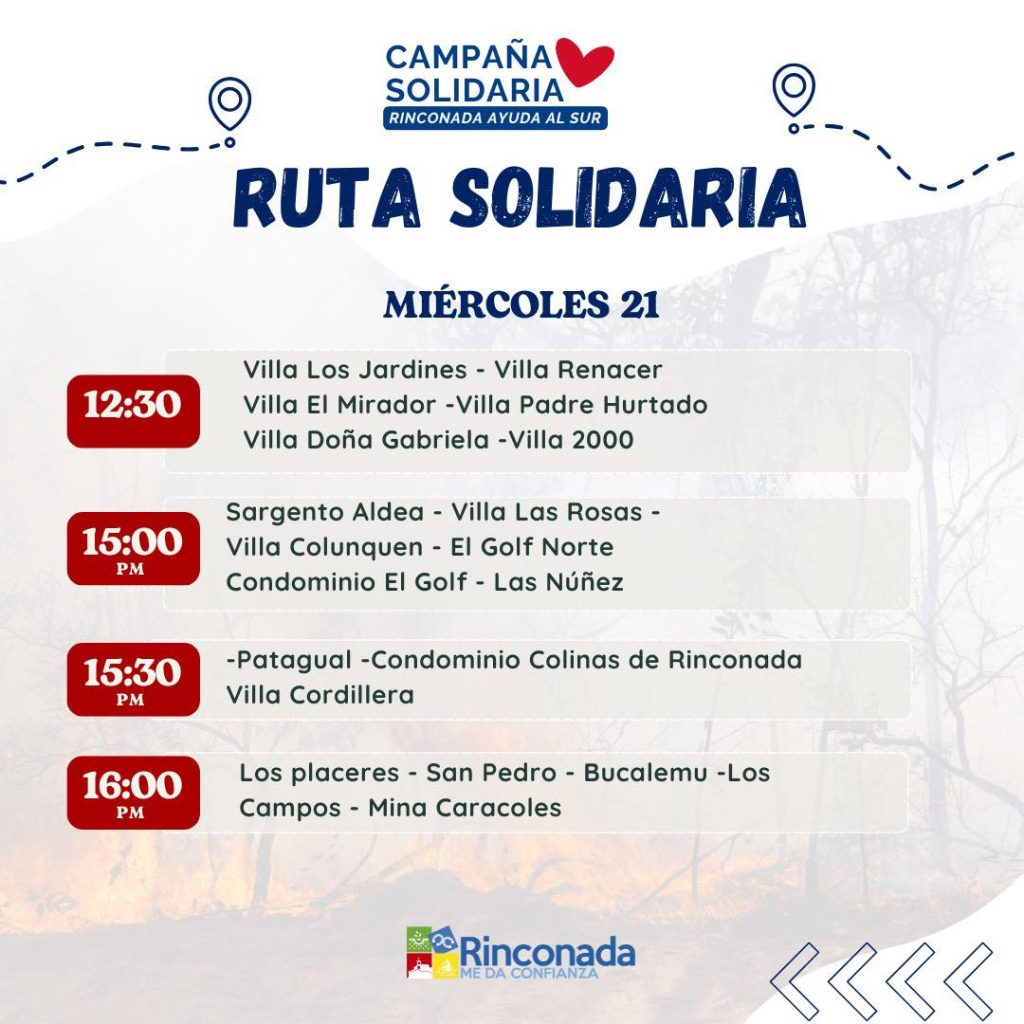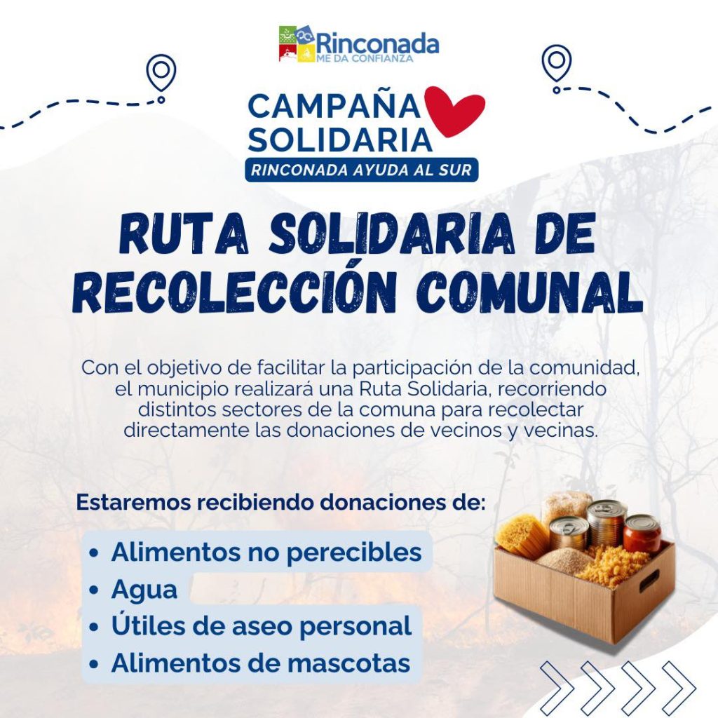 Con el objetivo de facilitar la participación de la comunidad, el municipio realizará una Ruta Solidaria, recorriendo distintos sectores de la comuna para recolectar directamente las donaciones de los vecinos , en el marco de la campaña solidaria “Rinconada Ayuda al Sur”, impulsada para ir en apoyo de las familias afectadas por los incendios forestales que afectan a las regiones de Ñuble y Biobío.