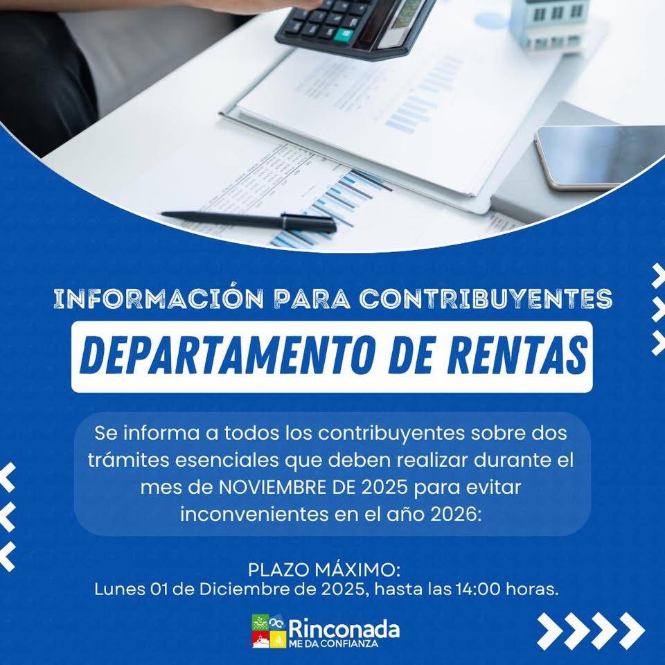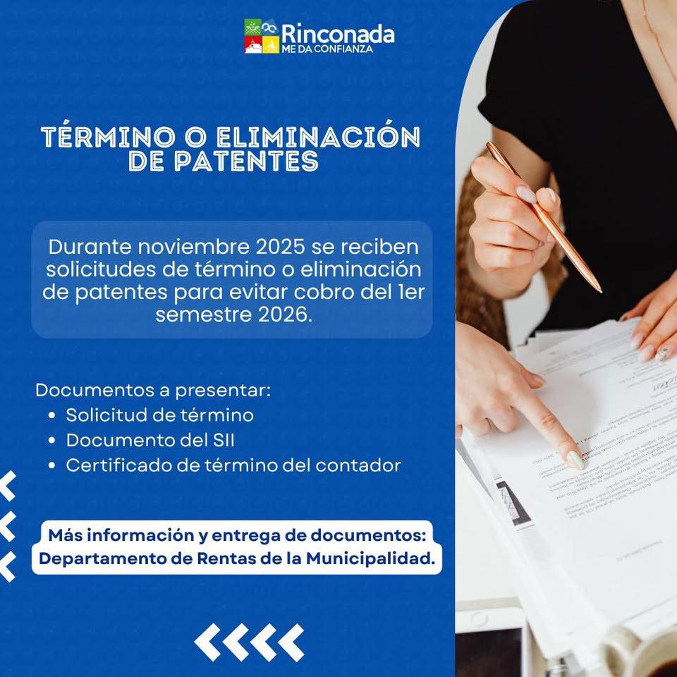 La Municipalidad de Rinconada reitera los plazos y requisitos que deben cumplir los contribuyentes para renovar patentes de alcoholes y para gestionar el término de patentes comerciales, industriales, profesionales y de alcoholes, trámites que deben efectuarse durante noviembre.