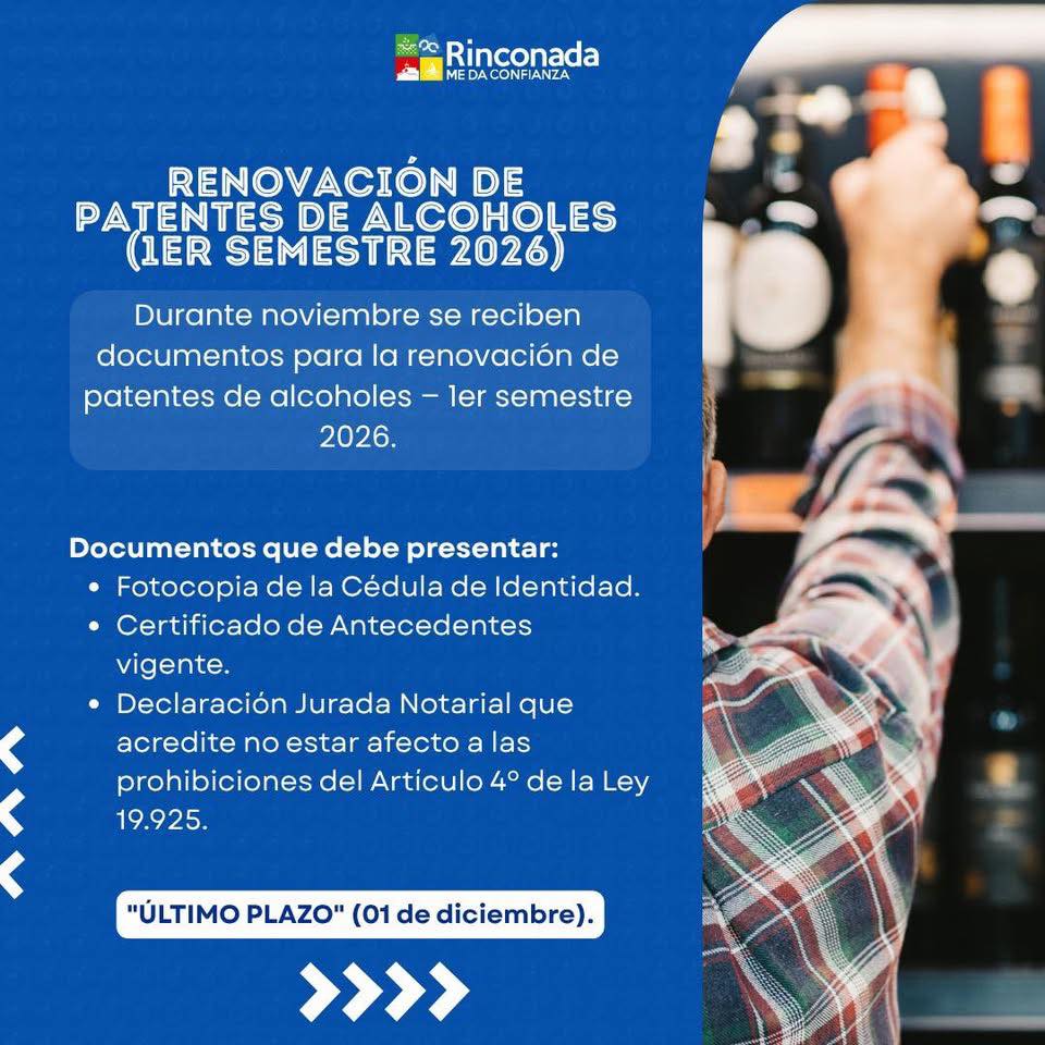 En el caso de las patentes de alcoholes, los documentos deben presentarse hasta las 14:00 horas del 1 de diciembre de 2025 en el Departamento de Rentas y Permisos de Circulación. Se requieren: