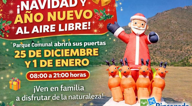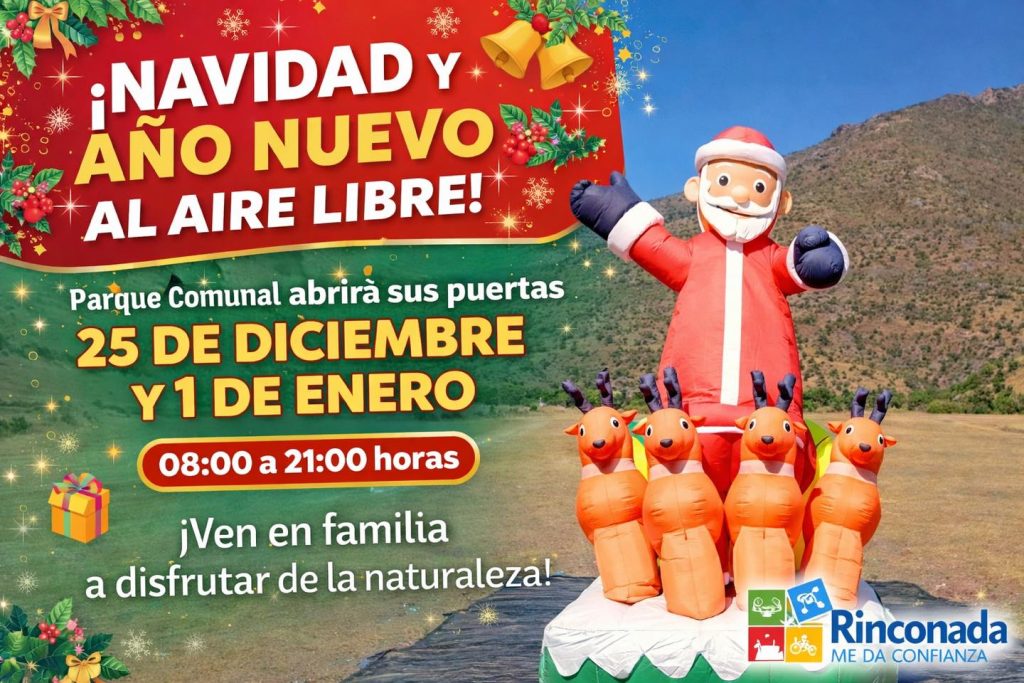 La Municipalidad de Rinconada informa a la comunidad que el Parque Comunal estará abierto de manera excepcional los días jueves 25 de diciembre y jueves 1 de enero, en horario continuado de 08:00 a 21:00 horas.