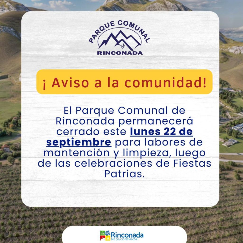 La Ilustre Municipalidad de Rinconada informa a la comunidad que este lunes 22 de septiembre el Parque Comunal permanecerá cerrado con el fin de realizar labores de mantención, tras la intensa actividad registrada durante las celebraciones de Fiestas Patrias.