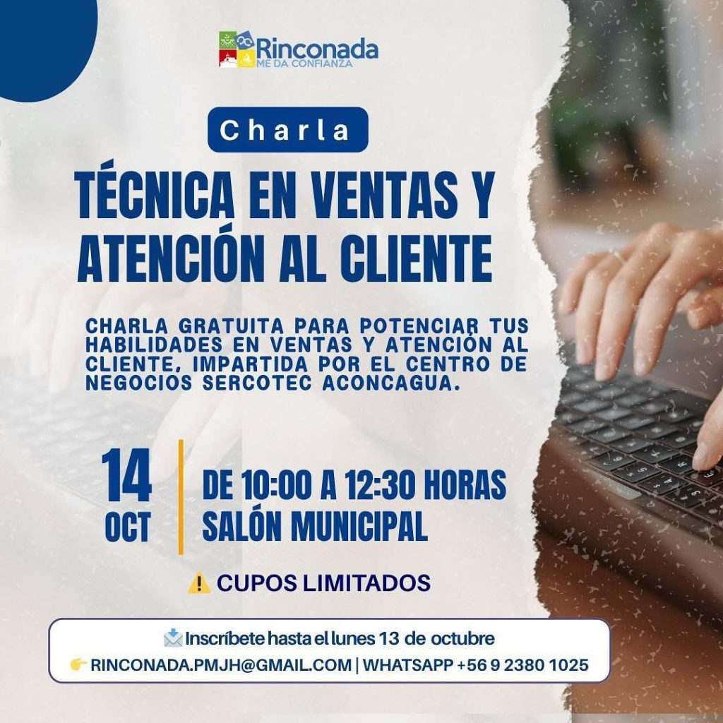 La Municipalidad de Rinconada, a través del Programa Mujeres Jefas de Hogar, invita a participar en la charla “Técnica en Ventas y Atención al Cliente”, orientada a emprendedores y/o personas que trabajan en atención de público.