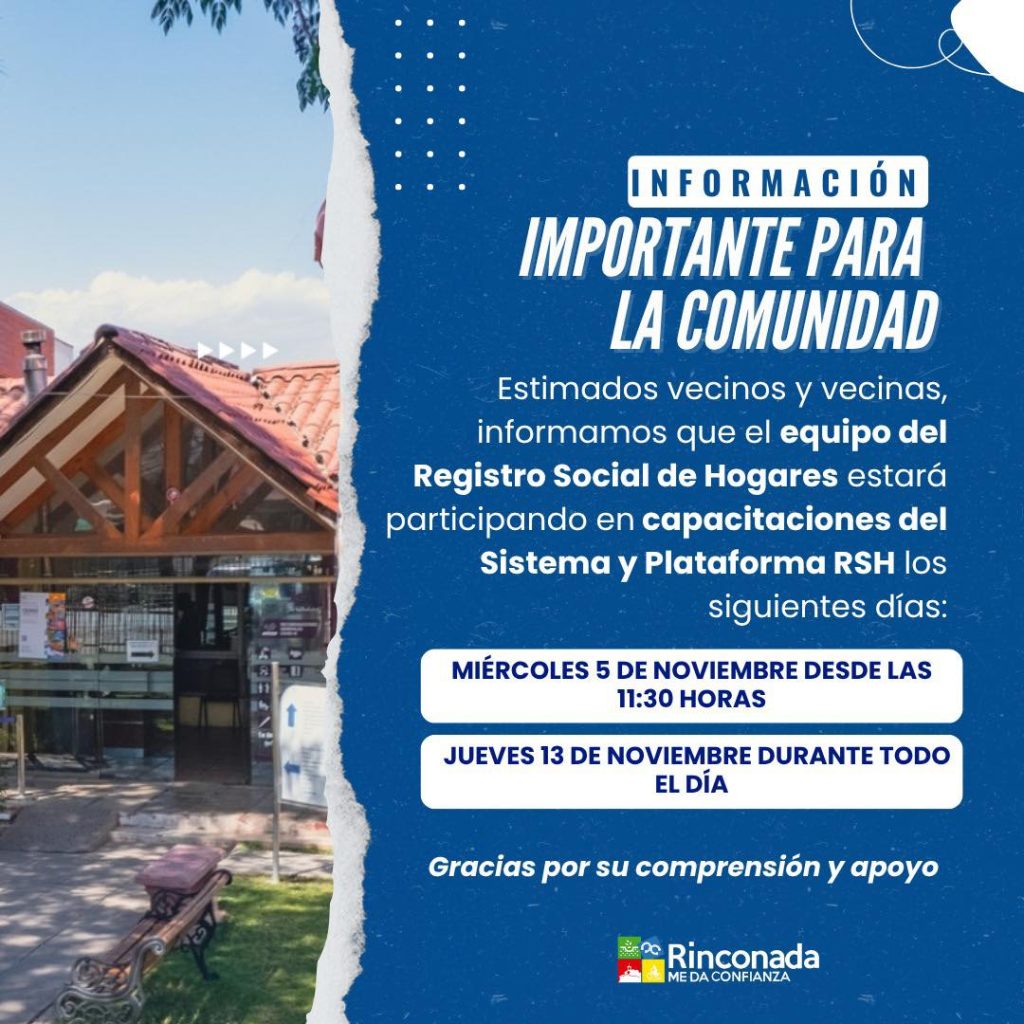 La Municipalidad de Rinconada informa a la comunidad que la Unidad de Registro Social de Hogares (RSH) no atenderá público a contar de las 11:30 horas los días miércoles 5 y jueves 13 de noviembre, debido a que su personal participará en jornadas de capacitación del sistema y plataforma del RSH.