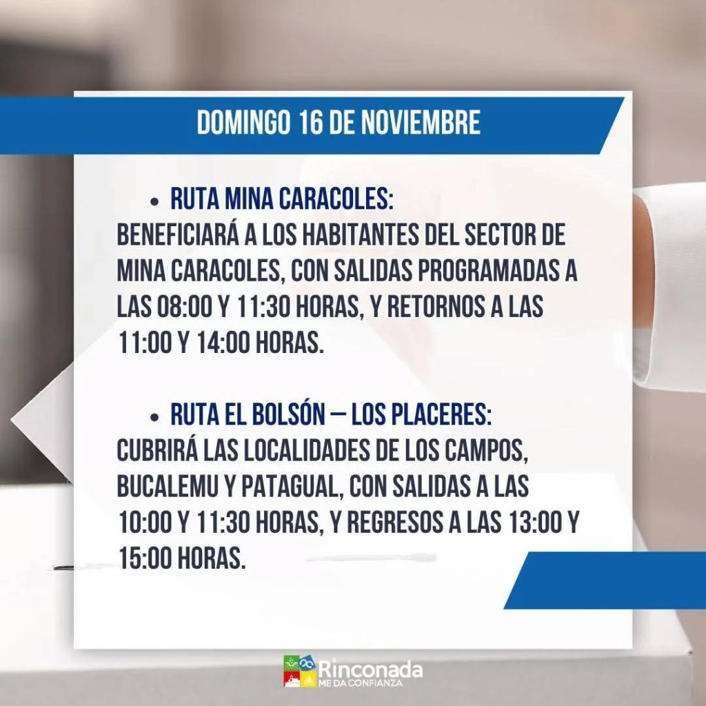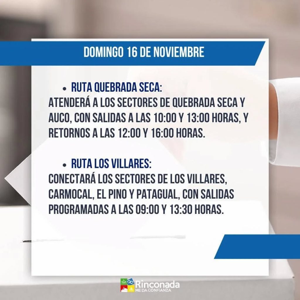 Con el objetivo de facilitar el traslado de los vecinos hacia sus respectivos locales de votación y asegurar así una amplia participación ciudadana, para la jornada electoral de este domingo 16 de noviembre en Rinconada habrán buses de acercamiento.