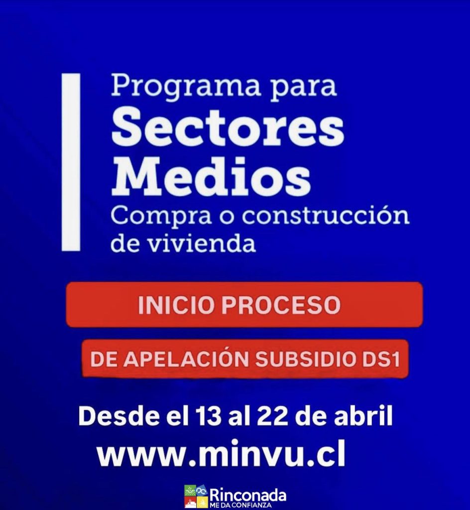 La Oficina de Vivienda municipal recuerda que este lunes 13 de abril el Servicio de Vivienda y Urbanización (Serviu) dará inicio al proceso de apelación del Segundo Llamado Nacional 2025 del Subsidio para Sectores Medios D.S.1.
