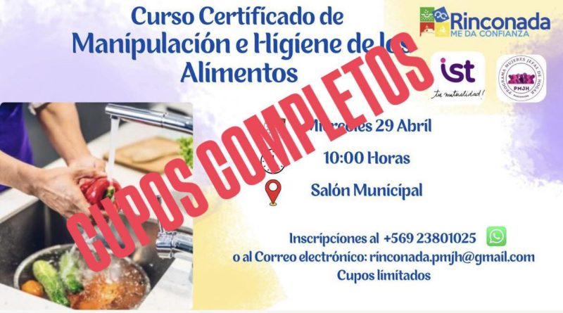 El Programa Mujeres Jefas de Hogar (perteneciente a SernamEG informó que ya se completaron los cupos disponibles para el curso de Higiene y Manipulación de los Alimentos, instancia que será dictada por IST y que se desarrollará el miércoles 29 de abril, a las 10:00 horas, en el Salón Municipal.
