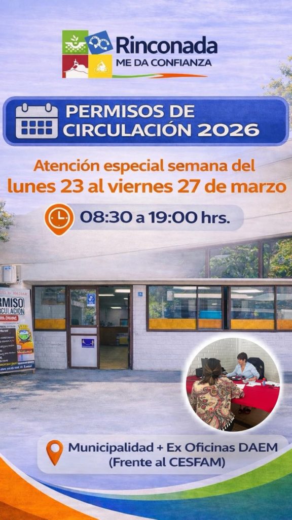Finalmente, se recuerda que la renovación del Permiso de Circulación 2026, también se puede realizar de manera online a través del sitio web municipal www.rinconada.cl, permitiendo así evitar desplazamientos y optimizar los tiempos de atención.